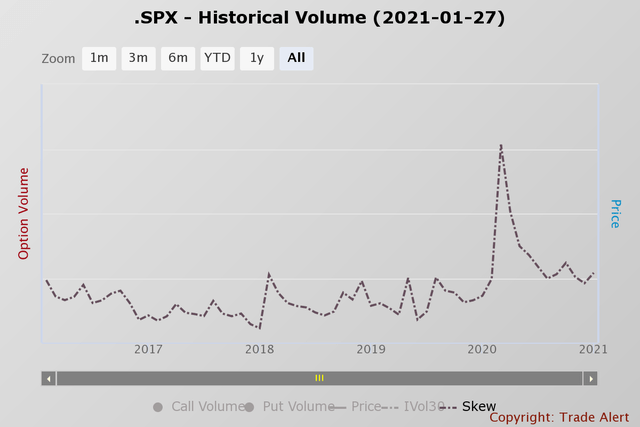 It's also helping to explain why the VIX has remained so high and why it failed to return to its pre-pandemic lows despite the S&P 500 trading at an all-time high. Implied volatility levels all over the market are highly elevated. Because there's so much call buying taking place across the market, investors today pay a lot more for call options than they use, which is noted by a high skew.